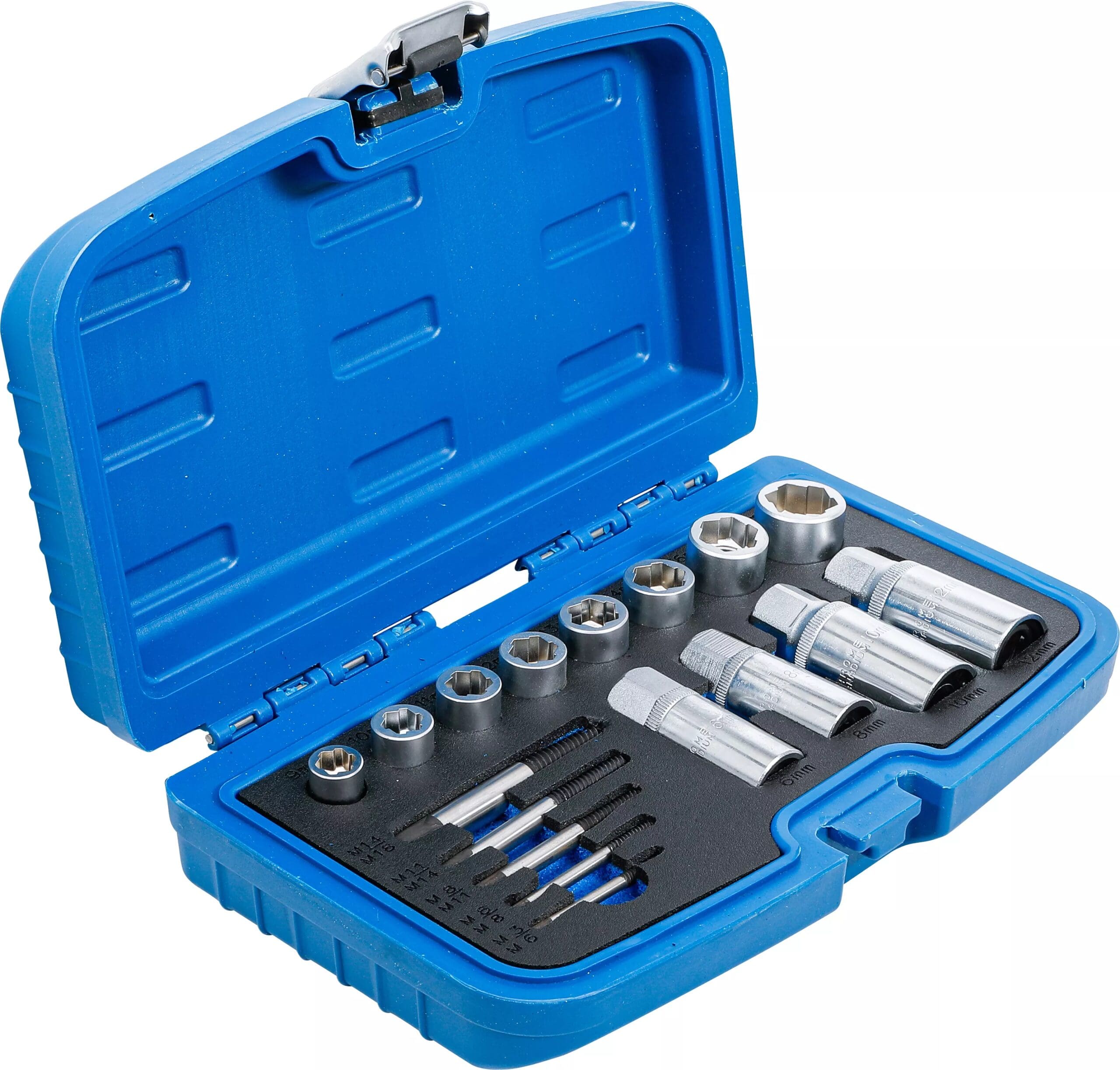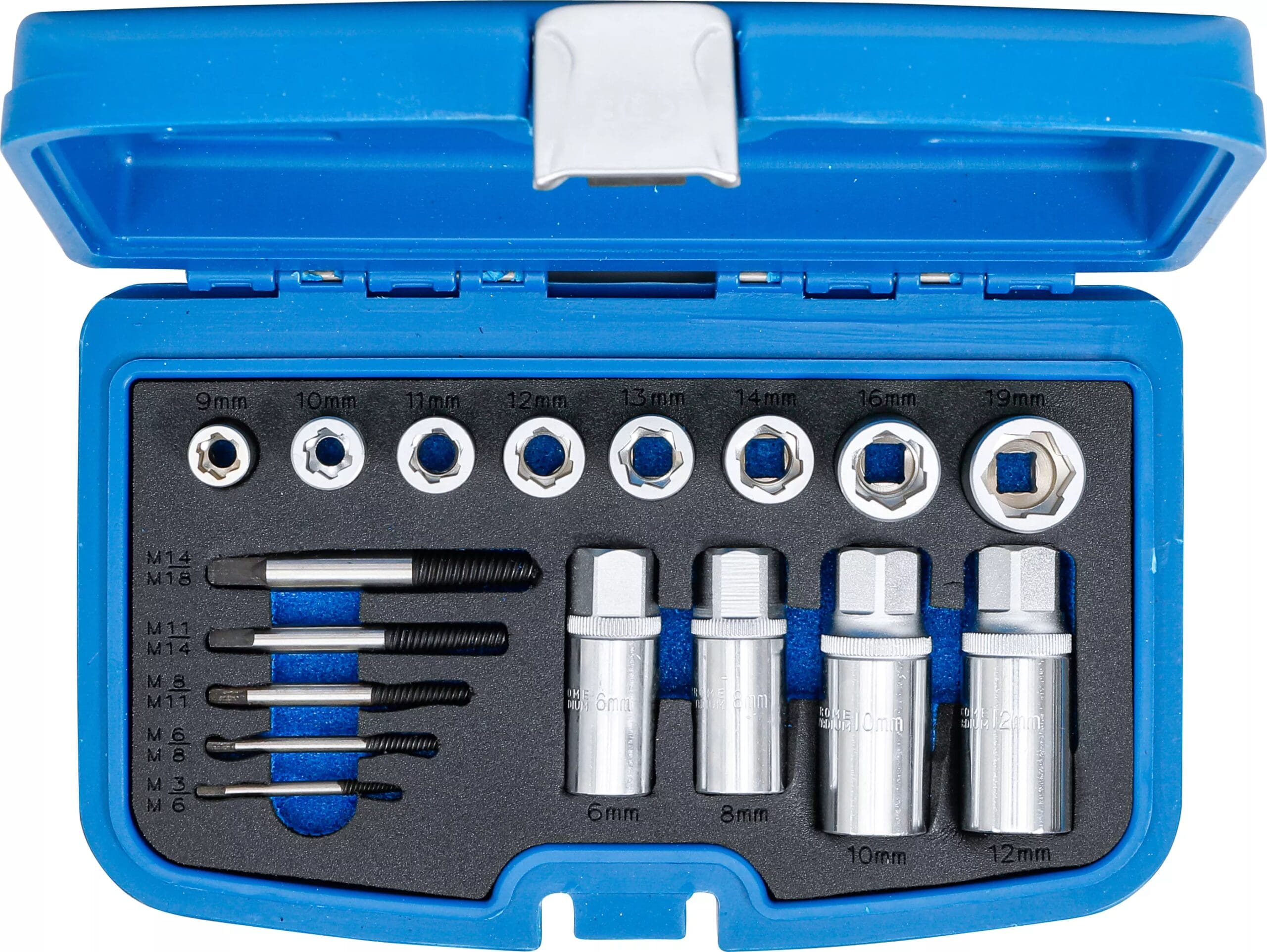 - 8 douilles spéciales avec un profil especial pour desserrer des vis six pans extérieurs arrondies et bloquées en 9 – 10 – 11 – 12 – 13 – 14 – 16 – 19 mm (à utiliser également pour extraire)