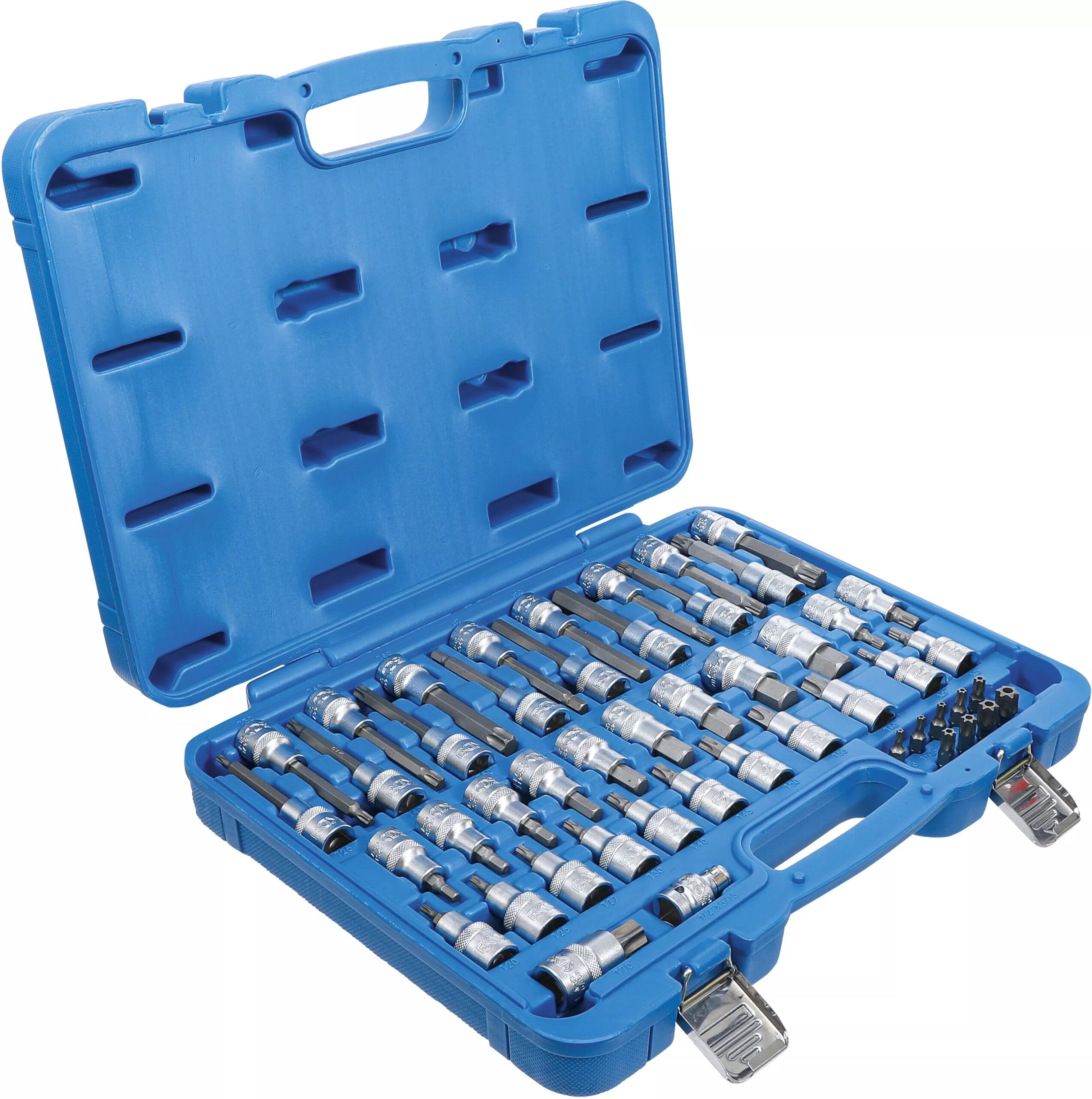 - 10 douilles à embouts, longueur 55 mm, 12,5 mm (1/2″), profil T (pour Torx) : T20 – T25 – T27 – T30 – T40 – T45 – T50 – T55 – T60 – T70